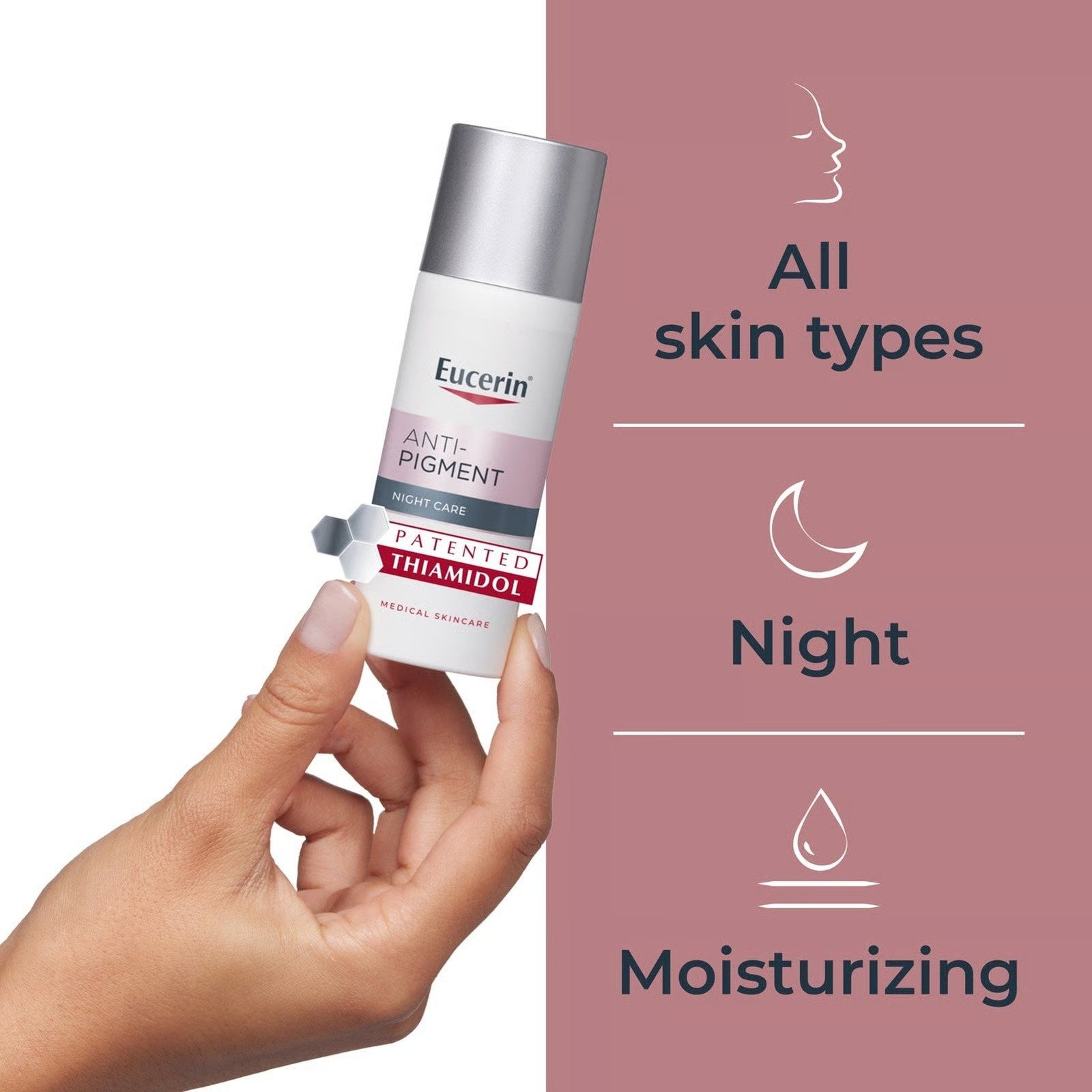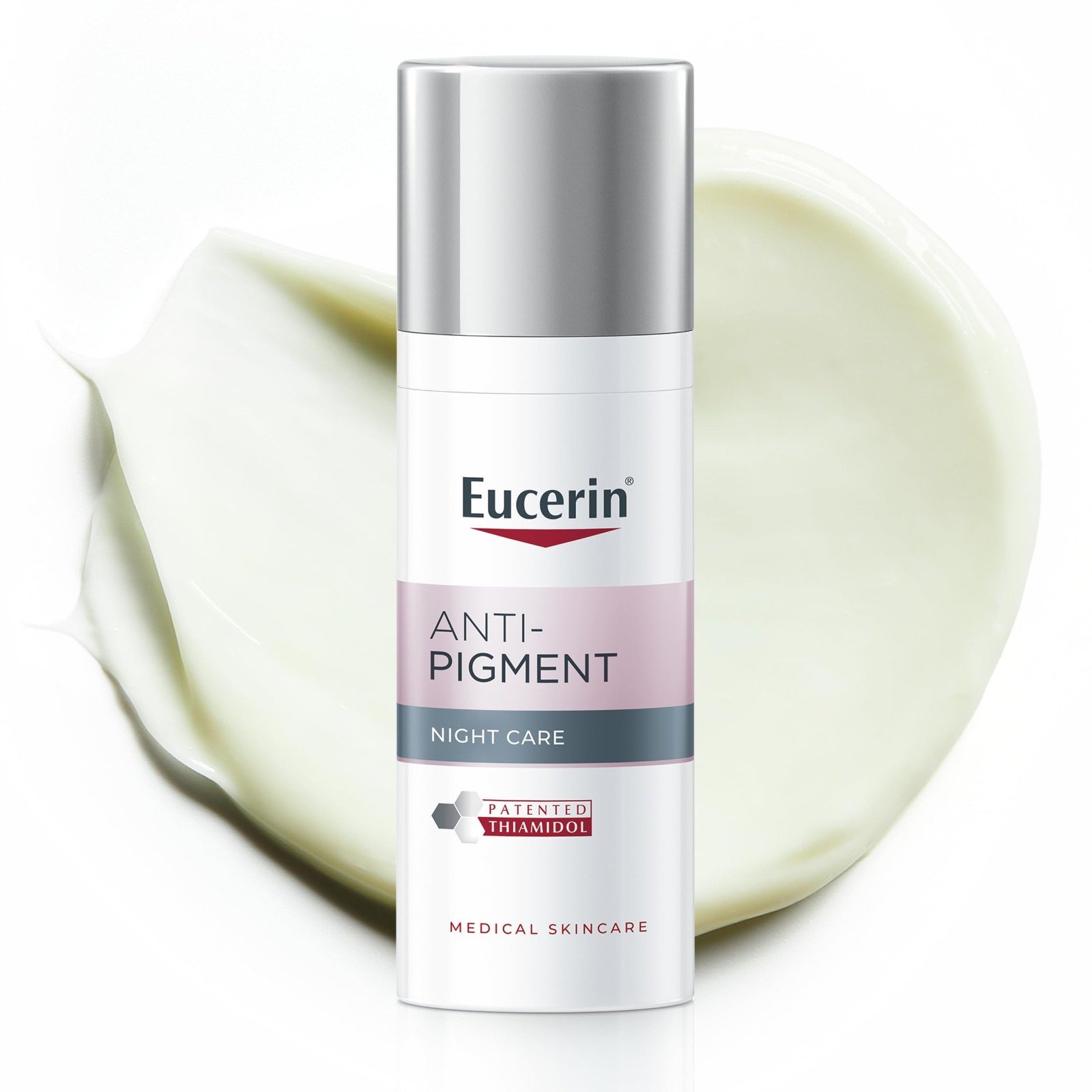 Eucerin Anti-Pigment Night Care is an advanced overnight treatment designed to visibly reduce dark spots, hyperpigmentation, and uneven skin tone while supporting skin regeneration during sleep. Powered by patented Thiamidol®, this night cream helps inhibit melanin production at its source, promoting a brighter, smoother, and more even complexion with continued use.